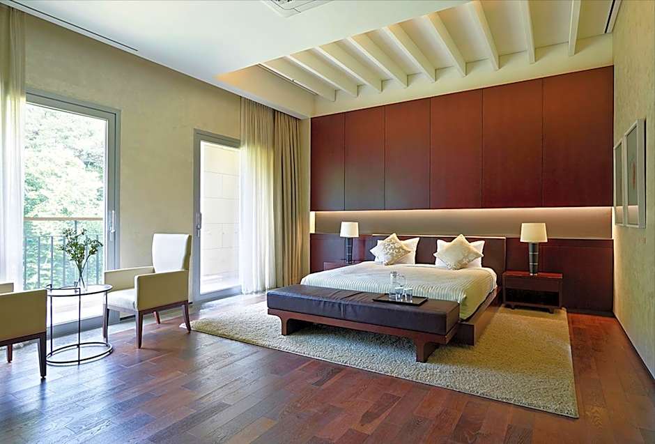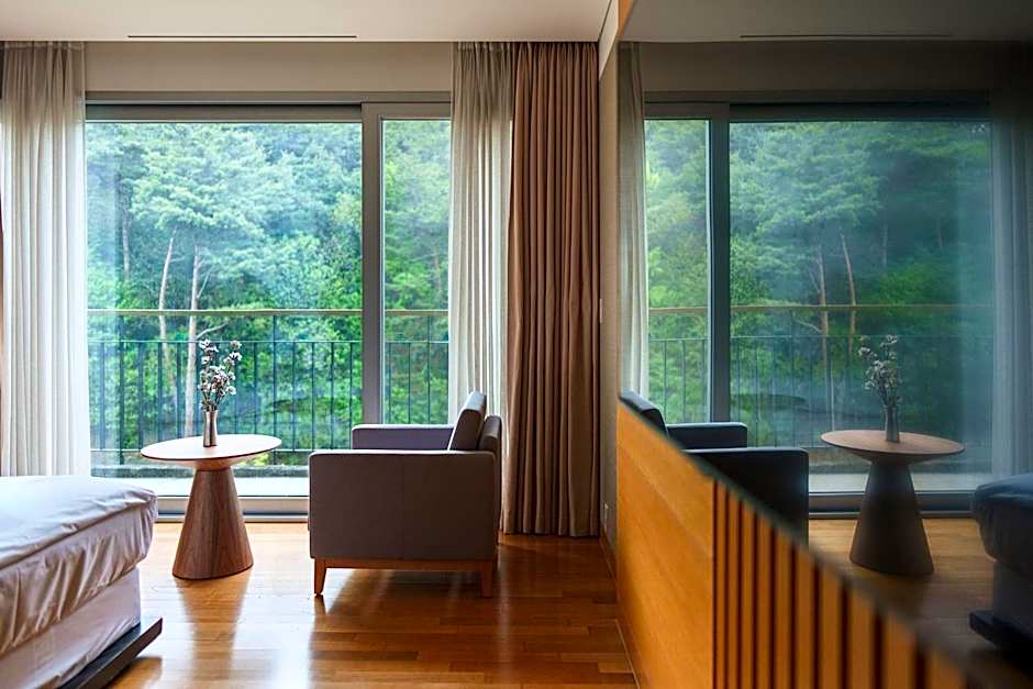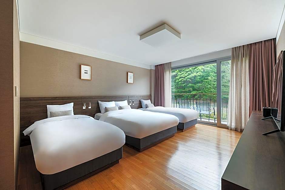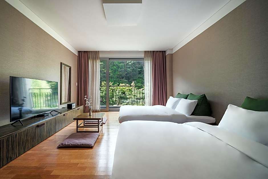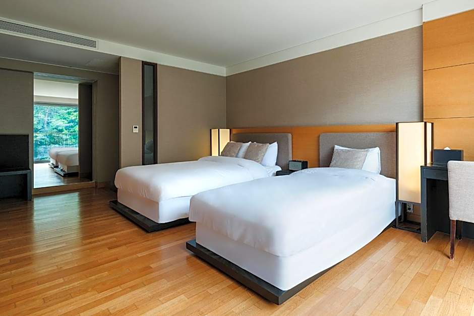 This air-conditioned room is furnished with one double bed and one single bed. It includes a 42-inch LCD TV with satellite and cable channels, a refrigerator, and a hairdryer. The private bathroom is equipped with a toilet featuring an electronic bidet. The room accommodates up to three guests with an additional charge. In the Deluxe Bed, indirect lighting without a main light source creates a softly lit and calming atmosphere.